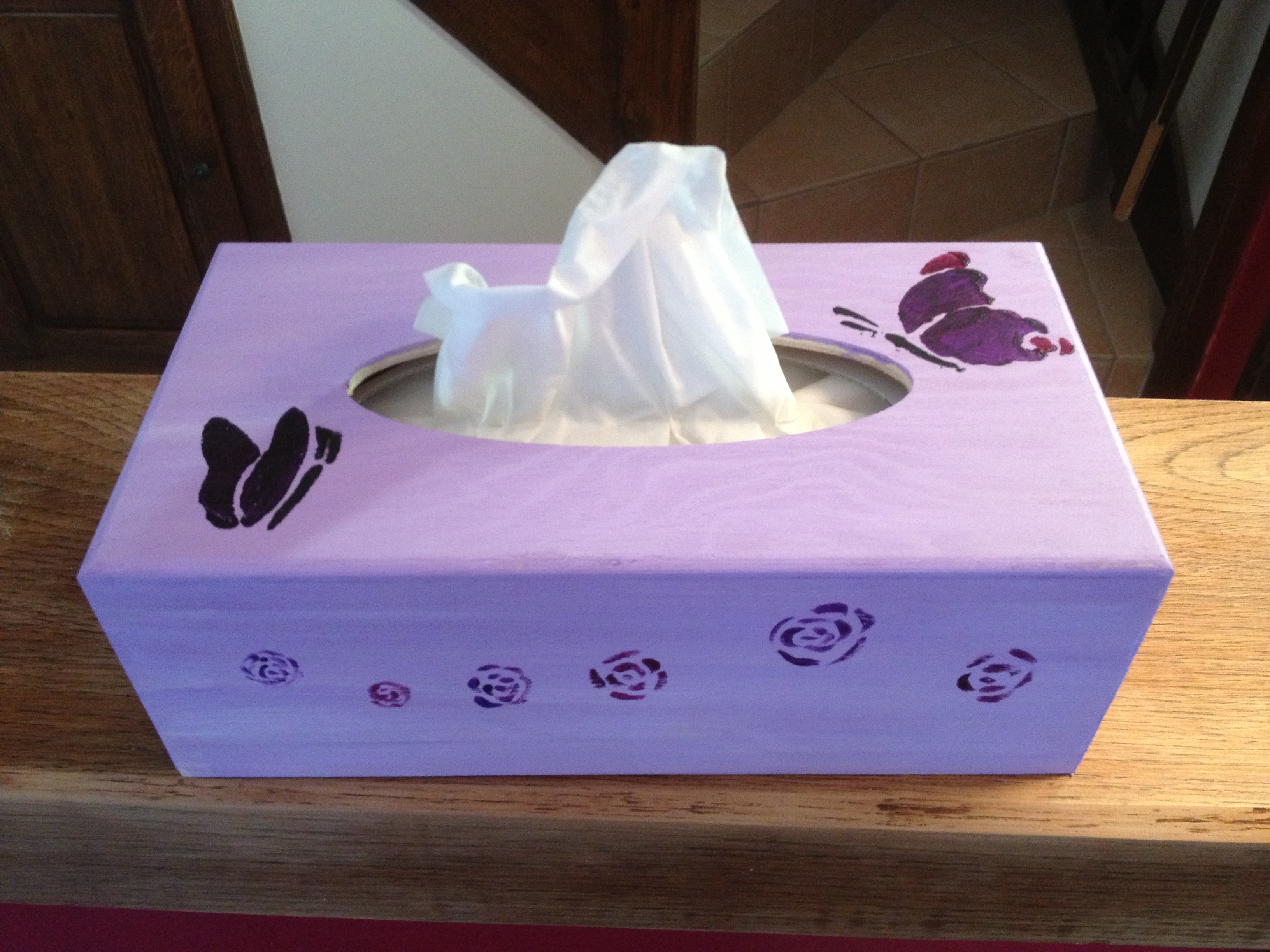 Une boite à mouchoir en bois ne coute que quelques euros ce n’est pas un gros investissement. Il existe plusieurs techniques pour la décorer moi j’ai choisi la peinture et le pochoir.