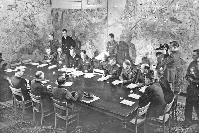 1) L’amiral FRIEDEBURG, commandant en chef de la Kriegsmarine 2) Le général JODL, chef d’État-major de la Wehrmacht, adjoint du maréchal Keitel, commandant en chef de l’Armée allemande 3) Le commandant OXENIUS, aide de camp du général Jodl |