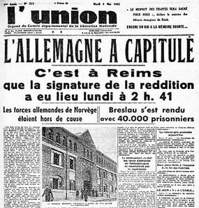 Pour tout le monde la date de la capitulation allemande en 1945 est le 8 mai. Or comme le montre cette une du journal L’Union, c’est le 7 mai que la vraie capitulation sans condition de la totalité des armées allemandes a été signée à Reims dans la War Room du QG des Forces Expéditionnaires alliées en Europe. A l’époque c’est un collège, c’est depuis devenu le Lycée Roosevelt, et la salle est devenu le Musée de la reddition