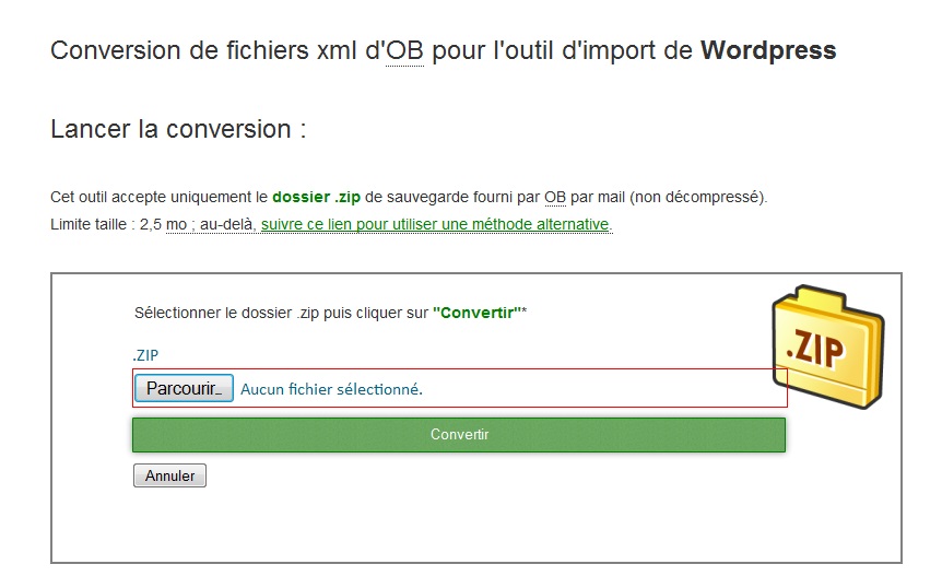 Worpresse ne permet pas d’importer les fichiers Overblog, il faut les convertir. Pour cela j’ai trouvé un petit outil gratuit super pratique qui se charge de tout