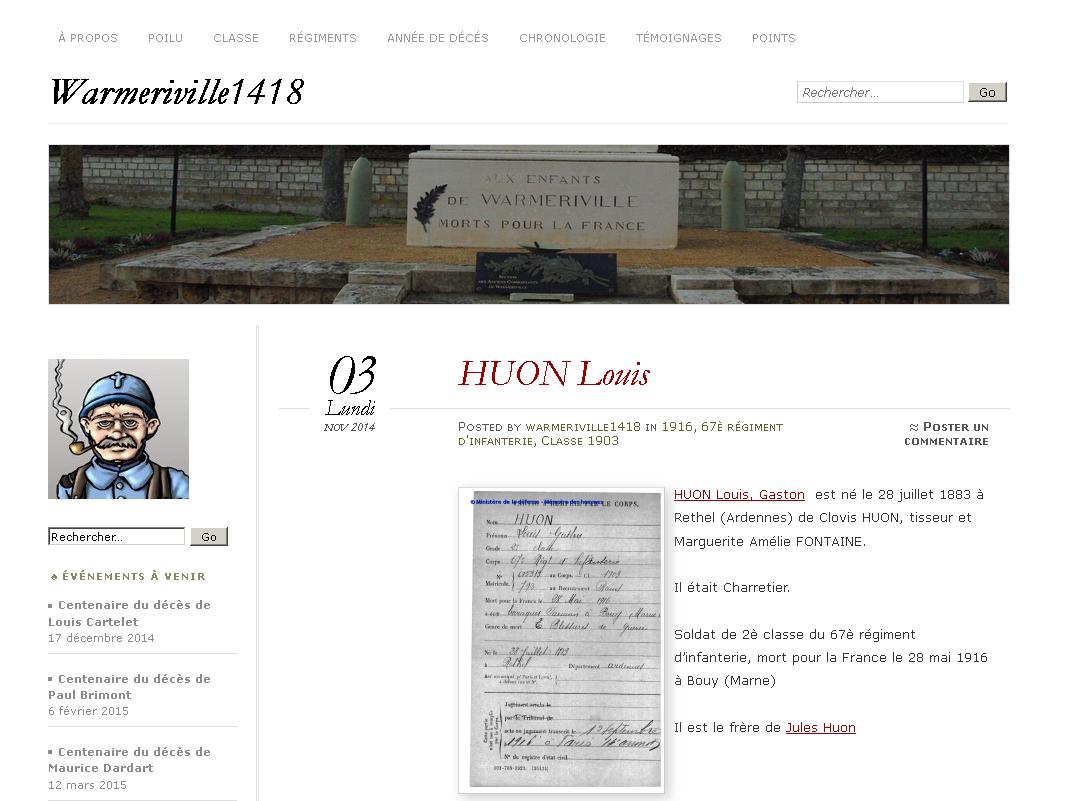 Et puis j’ai trouvé que l’indexation ne me suffisait pas, j’ai voulu en savoir plus sur ces poilus qui sont un peu devenus MES poilus. C’est pourquoi j’ai créée un second blog Warmeriville1418 qui leur est dédié. J’espère à terme pouvoir rédiger pour chacun d’entre eux une petite biographie. J’ai déjà deux autres personnes qui ont eu la gentillesse de rédiger des billets pour ce blog sur des poilus qu’ils connaissaient bien. J’espère que d’autres pourront effectuer cette démarche.