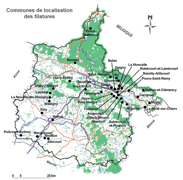 La majorité des filatures se trouve dans le bassin sedanais, dont elles constituent l’activité historique depuis l’installation de la manufacture royale du Dijonval au milieu du 17e siècle. Alors que ce foyer est le plus ancien, c’est également celui dont l’activité a perduré le plus tardivement (3e quart 20e siècle). La période d’activité des usines de la vallée de la Vaux n’a par contre pas dépassée la Première Guerre mondiale. Les premières filatures mécanisées apparaissent à la suite de celles d’Angecourt et de Mouzon, construites sous l’impulsion du baron Poupart de Neuflize, respectivement en 1807 et 1809. Elles utilisaient directement l’énergie hydraulique et très vite la vapeur (Lainé à Rethel), puis l’électricité produite in-situ par l’intermédiaire de turbines hydroélectriques. Les bâtiments de hauteur caractérisent les premiers âges de la filature concentrée. Lalobbe, Mouzon, Angecourt, Givonne et Pouru-Saint-Remy (bâtiments disparus, mais documentés), Rethel, La Ferté-sur-Chiers et Chémery-sur-Bar (bâtiments conservés) en sont les meilleurs exemples. A la fin du 19e siècle, les filatures se développent en surface et non en hauteur, à l’exemple d’Hannogne-Saint-Martin où la filature primitive qui brûle est reconstruite avec des bâtiments à shed en rez-de-chaussée. Sur la fin du 19e siècle, alors que le tissage est intégré aux unités de production, les usines s’étendent. Les sites anciens s’adaptent (Givonne), d’autres sont créés de toute pièce (usine de l’espérance à Floing).