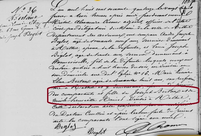 Sachant que pour Rethel, il n’y a aucun acte d’état-civil avant 1839, je risque de rester bloquer sur mon sosa 250 Joseph Bertaux donc l’unique mention que j’ai se trouve sur l’acte de décès de sa fille. Mon seul espoir est de consulter tous les actes de décès entre 1839 et 1874 pour retrouver Joseph Bertaux qui est décédé à Rethel, mais je ne sais pas quelle année.
