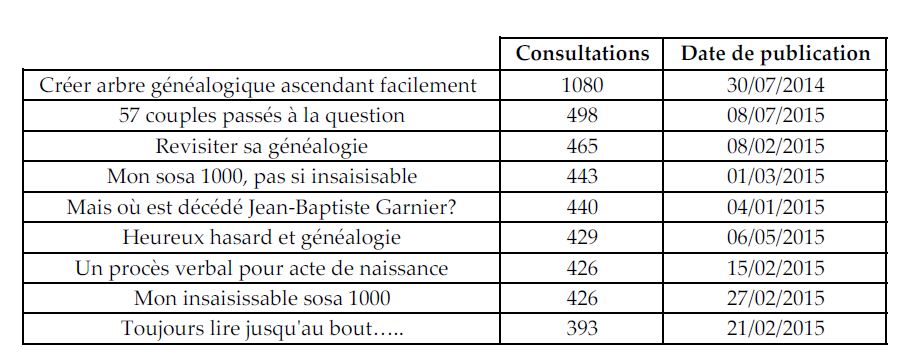 En tout cas, même si mon blog n’est pas 100% consacré à la généalogie je suis bien obligée de constater que c’est ce qui intéresse principalement « mes » visiteurs. Pour preuve, les 10 billets les plus lus du blog.