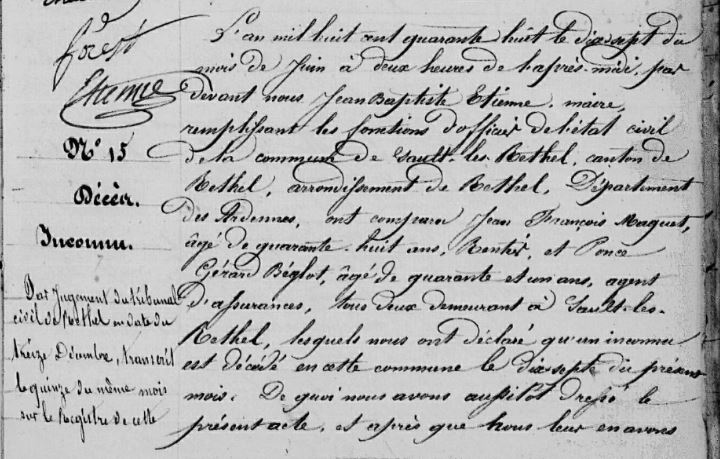 Or en faisant des recherches dans les archives des Ardennes sur Sault-les-Rethel, je me suis arrêtée sur l’acte de décès d’un inconnu datant du 17 juin 1848 car l’un des témoins pouvait appartenir à ma famille. A priori ce n’est pas le cas, mais la mention en marge de l’acte a attiré mon attention, en effet, cet inconnu a eu la chance si je peux dire d’être reconnu quelques mois plus tard.