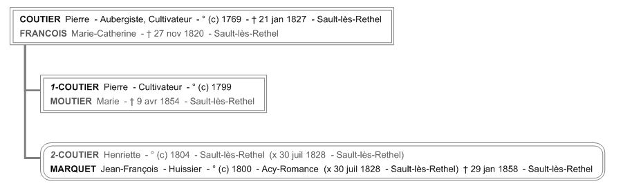 Ils s’installeront à Sault-les-Rethel et auront au moins deux enfants Pierre, Joseph qui nait vers 1799 et Henriette vers 1804. Pierre décèdera le 17 janvier 1827 chez lui quelques années après Marie-Catherine décédée en novembre 1820.