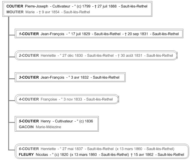 Pierre-Joseph est le fils de Pierre Coutier et de Marie-Catherine François. Tout comme son père il sera aubergiste. A-t-il repris l’auberge de ses parents ? En tout cas il s’installe également à Sault-les-Rethel. Il épouse à Coucy, une commune à 10 kilomètres de chez lui, le 29 octobre 1828 Marie-Antoinette Moutier. Ils auront au moins quatre enfants : Henriette qui ne survit que quelques mois en 1831, Adelina en 1834, Henri en 1836 puis enfin Eugénie en 1841. Marie-Catherine décèdera le 9 avril 1854. Pierre-Joseph décédera chez lui à Sault-les-Rethel le 27 juillet 1888, sa femme est déjà décédée.