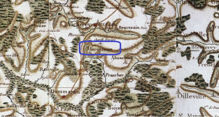 Jusqu’à la révolution, Maconcourt faisait partie de la Prévôté de Vicherey. Dès 1145, il y avait à Vicherey un château fort dans lequel les chanoines de Toul entretenaient une garnison. La prévôté subit le sort des Trois Evêchés, occupés par la France en 1552 et annexés par elle après les traités de Westphalie de 1648 qui mirent fin à la guerre de trente ans. Durant cette période terrible pour la Lorraine, Maconcourt a dû être rasé, car il ne subsiste aucun édifice daté antérieur à 1687 à l’exception de la chapelle Ferrières. La famille a donc dû vivre cette terrible période.