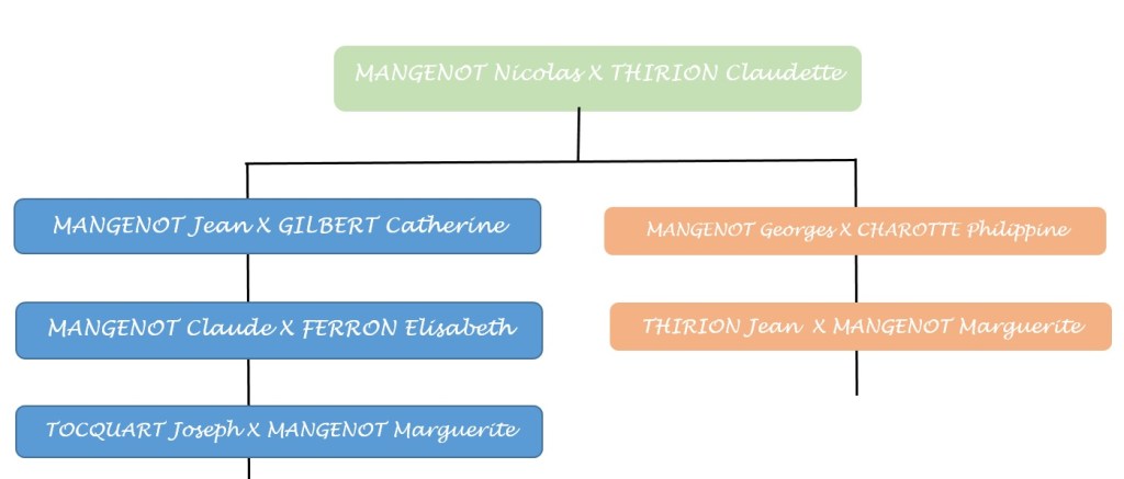 Marguerite MANGENOT, fille de Claude MANGENOT et Elisabeth FERRON épouse le 4 février 1716 Joseph TOCQUART (sosas 798 et 799).