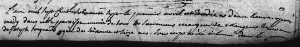 « Cejourd’hui 4è février mil sept cent cinquante trois a été inhumé dans le cimetière de cette paroisse Joseph Tocquart homme âgé d’environ soixante trois ans laboureur dans le lieu lequel a eu le malheur de mourir parmy la campagne près du pré appellé les grandes goutes revenant pendant la nuit dans un temps affreux de froid et neige fondue du village de Beuvezin vers les neuf heures du soir du 1er de ce mois. Son corps n’a été trouvé que vers les cinq heures du soir du jour de la purification, ensuite transporté dans sa maison, visité et reconnu par les officiers du lieu. Il avait toujours vécu en bon chrétien et paroissien […] il a été enterré avec les cérémonies prescrites par l’église en présence de son épouse Marguerite Mangenot, ses enfants et toute la paroisse par moy curé »