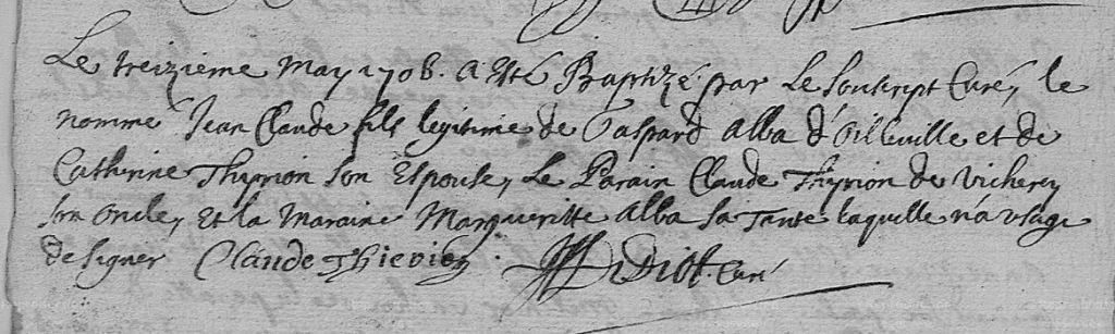 Jean-Claude Alba est né en 1706 à Oëlleville de Gaspard et Catherine Thirion. Orphelin de mère à deux ans il sera élevé par son père et sa belle-mère.