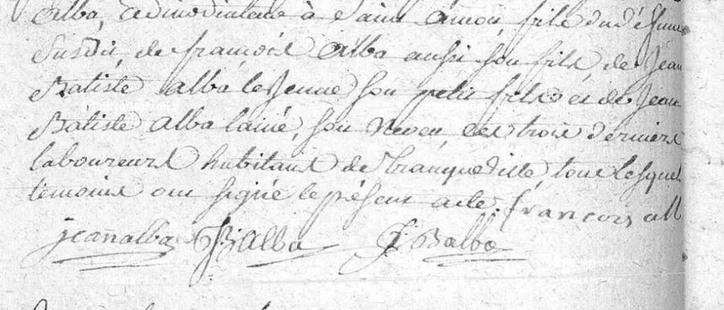 Du fait de leur différence d’âge, Marie-Anne est née en 1732, la plupart des arbres en ligne la marie avec Jean-Claude, fils du premier né en 1739. Cependant lorsque Marie-Anne se remarie l’année suivante elle a pour témoins François Alba (57 ans) et Jean-Baptiste Alba (53 ans) indiqués comme « les deux fils du déffunt de la mariée ». Ce qui indique bien que le Jean-Claude qui a épousé Marie-Anne est le père né en 1706.