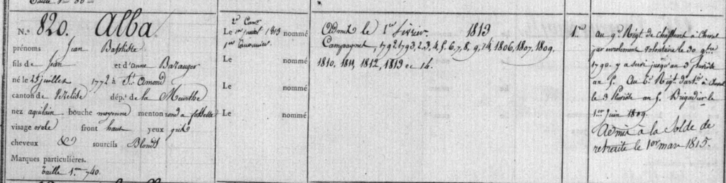 - Jean-Baptiste 1772 : Il est engagé volontaire dans l’armée révolutionnaire en 1790 il survivra à 25 années de service et 19 années de campagnes dont la plupart des campagnes napoléoniennes pour prendre sa retraite en 1815. Il sera chevalier royal de la légion d’honneur en 1814. En 1816 il retourne en Meurthe-et-Moselle où il se marie. Il décèdera en 1848.