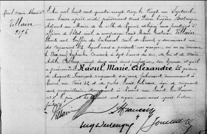 Raoul est le fils de Louis Villain et Marie-Adèle Collery. Il passe son enfance à Reims, ville où il est né. Dernier né, il n’avait que deux ans quand sa mère fut internée. Toute sa vie il recherchera cet amour maternel qui lui a tant manqué, même si il semble être allé régulièrement lui rendre visite.