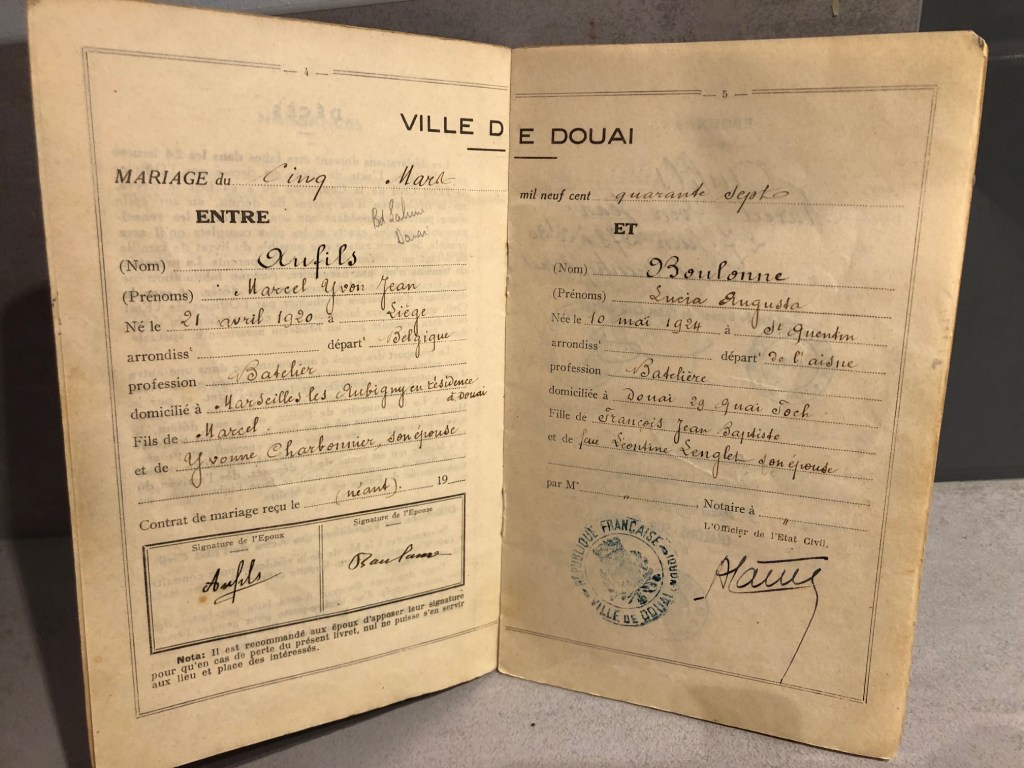 En réfléchissant, je retrouve les dossiers papiers que j’ai sur cette branche (je pensais les avoir rendus au papa). Et la chance veut que dans ces dossiers se trouve le livret de famille de ses arrière-grands-parents. Ainsi nous avons la bonne date et surtout la bonne commune pour le mariage.