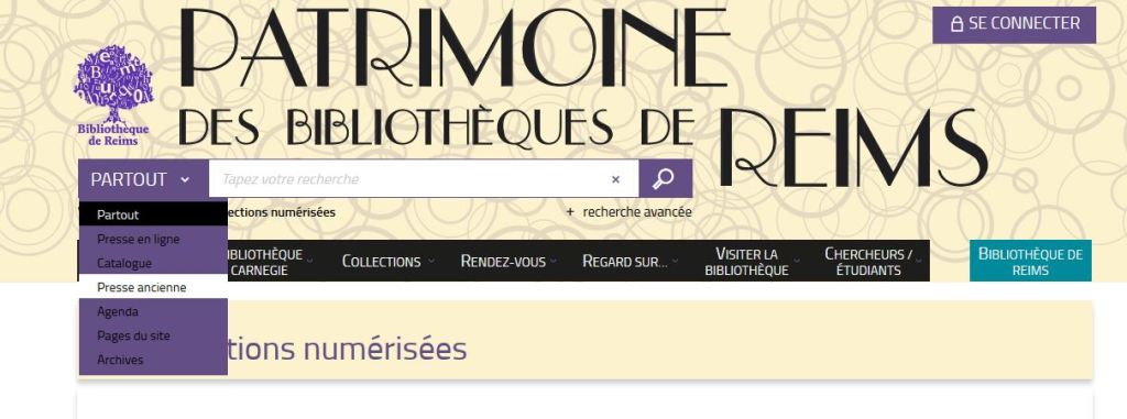 Sur le site de la bibliothèque, sélectionner la rubrique patrimoine en haut à droite. Vous accéderez directement celle-ci.