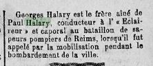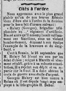 Citation de Georges Halary le frère de mon arrière-arrière-grand-mère dans le Courrier de la Champagne du 22 novembre 1915.