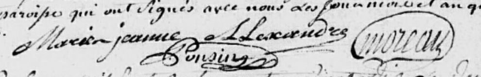 L’an de grâce mil sept cent quatre vingt dix, le vingt trois novembre. Je Henry Ponsin prêtre vicaire de cette paroisse ay baptisé la fille de Pierre Dumay et de Marie Jeanne Bourg ses père et mère mariés ensemble et habitant du Haut chemin hameau de cette paroisse a laquelle née du même jour on a imposé le nom de Jeanne Marie Joseph. Le parrain a été Jean-Baptise Leroux frère maternel de l’enfant, et la marraine Marie Josephe Marle lesquels ont été représentés par Nicolas Moreau et Marie Jeanne Alexandre de cette paroisse qui ont signé avec nous les jours et mois et an