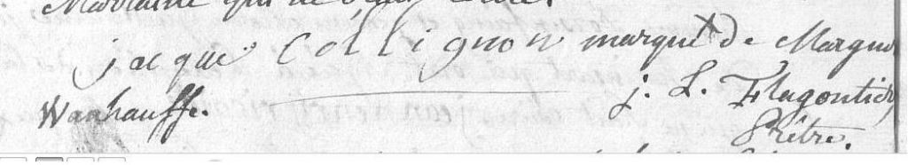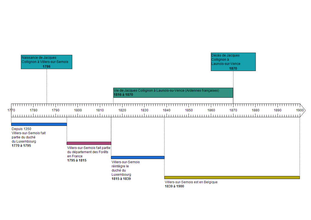 Jacques fils légitime de à Pierre Collignon, charbonnier de profesion et à Angélique Robinet de Houdemon ÿ est né le cinq février vers minuit mil sept cent quatre vingt et six, et fut baptisé le six à Villers-sur-Sémois. Les parrains sont Jacques Collignon jeune homme de Buzenol et Marguerite Wanhauffe jeune fille de Houdemont qui ont signé à l’exception de la marraine qui ne sait écrire
