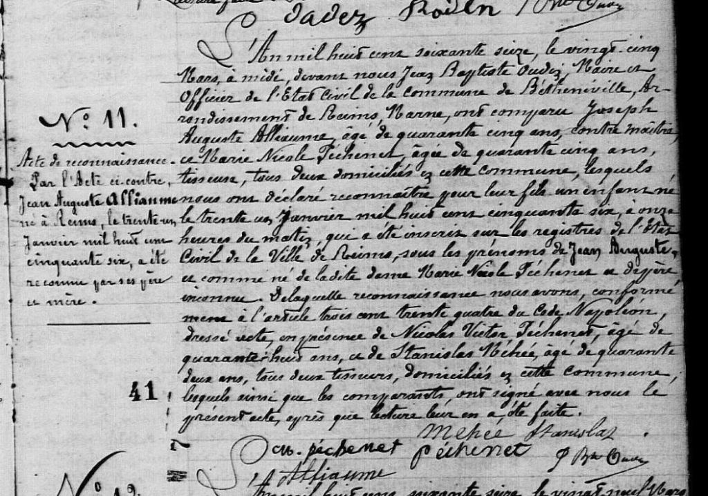 Acte de reconnaissance de Jean-Auguste Alliaume né Péchenet à Bétheniville en 1876 – Source AD 51 [en ligne]