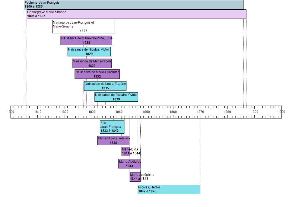 Césaire Ovide PÉCHENET né le 1e juillet 1839. Il deviendra tisseur. Il épouse le 18 novembre 1861 à Betheniville Pauline Edouarine DURAND (1842-1876)