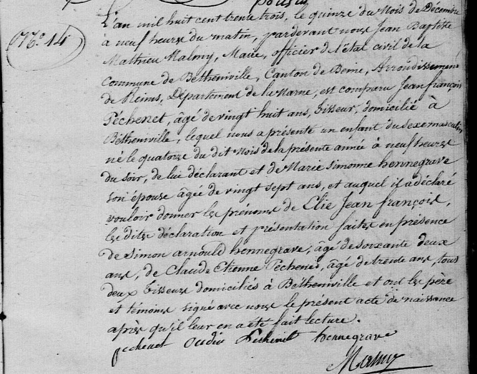 Acte de naissance d’Elie, Jean-François le 14 décembre 1833 à Bétheniville – Source AD 51 [en ligne]