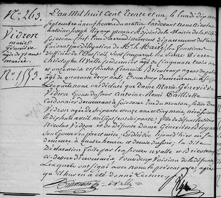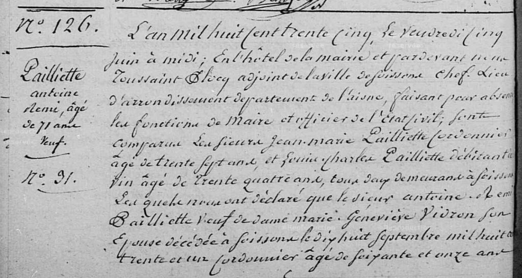 Il existe un second Jean-François Pailliette natif de Soissons dont l’âge pourrait correspondre car il est né en 1757. Je l’ai exclu la possibilité que ce soit lui qui est décédé à Charleville car j’ai retrouvé son acte de mariage avec une certaine Barbe Frion.