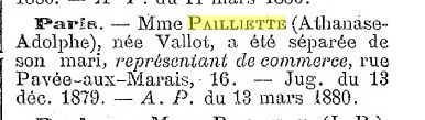 Le mariage ne fonctionne pas longtemps car en mars 1880, Athanase fait publier dans le journal « Archives commerciales de France » un avis de séparation.