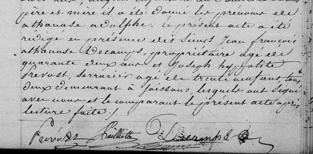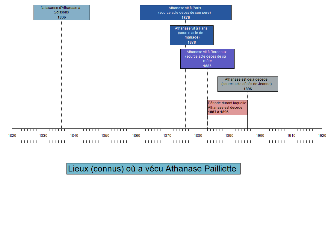 En 1883, Athanase est présent à Soissons pour déclarer la décès de sa mère. Il vit alors à Bordeaux sans adresse précisée dans l’acte.