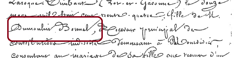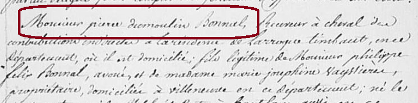 En remontant à la source je fini par retrouver l’acte de naissance. Ainsi son nom de baptême est Pierre Dumoulin BONNAL, Dumoulin ici étant le deuxième prénom. Cette information est importante pour la suite.
