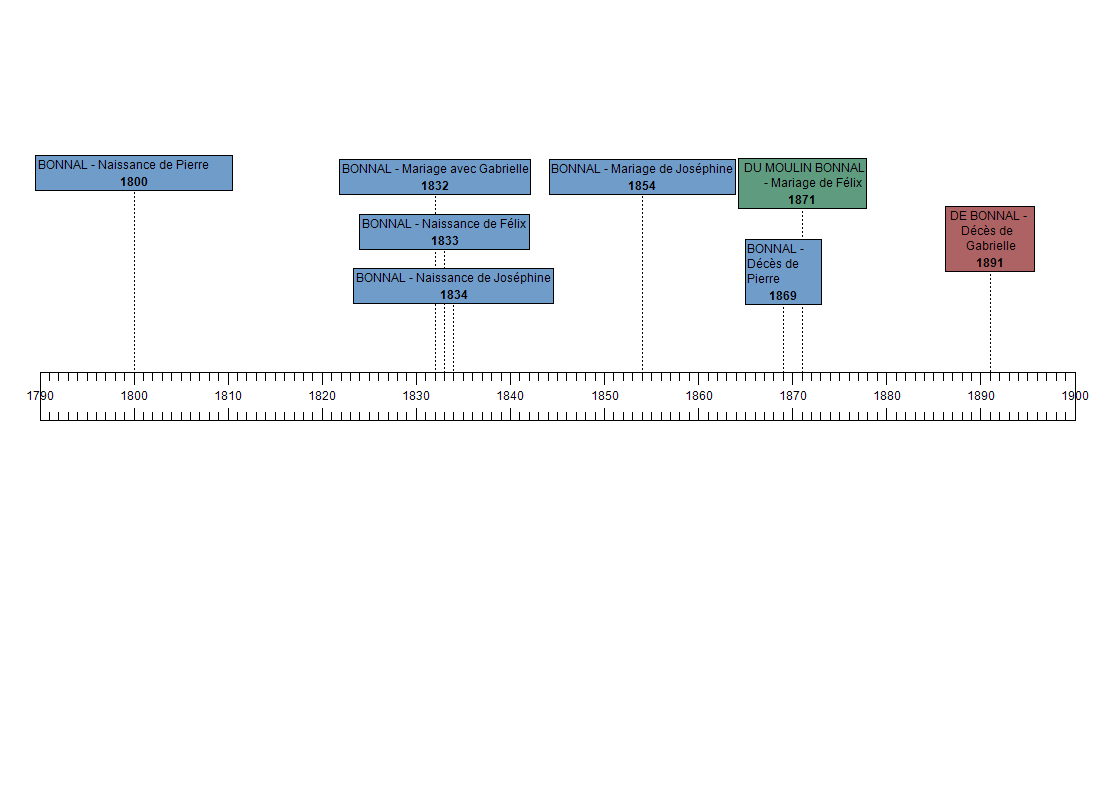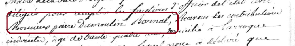 Là où cela se complique c’est à partir du mariage de Félix, Benjamin en 1871. En effet pour lui et sa descendance le nom de famille devient DUMOULIN BONNAL. Je n’ai pas retrouvé de jugement actant ce changement de nom mais une décision officielle a bien dû être prise à un moment donné pour valider cela.