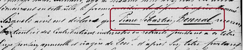Concernant Pierre j’ai retrouvé son décès à Villeneuve-sur-Lot en 1869, cette fois il est nommé Pierre Sébastien BONNAL. C’est donc sur cet acte qu’apparait pour la première fois le prénom Sébastien qui a prêté à confusion dans nos recherches.