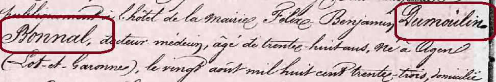 L’année suivante en 1833, toujours à Agen né leur premier enfant Félix, Benjamin, dans cet acte Pierre est de nouveau nommé Pierre Dumoulin BONNAL.