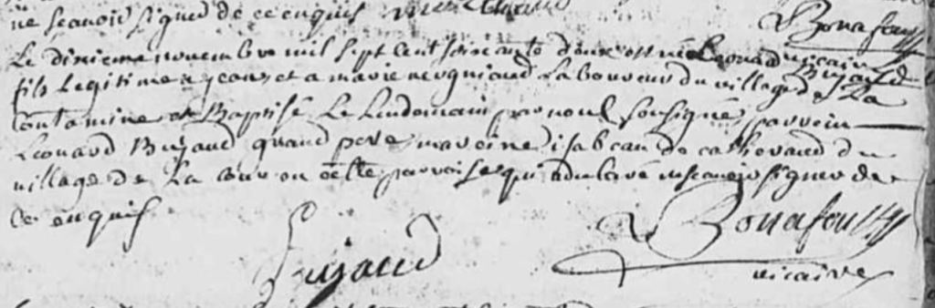 Pour ajouter à la confusion, je ne trouve pas l’acte de naissance de Léonard BUJAUD fils de Jean et Marie COUTURIER. Mais l’année où il est censé être né j’ai bien un Léonard BUJAUD fils de Jean et Marie VERGNIAUD