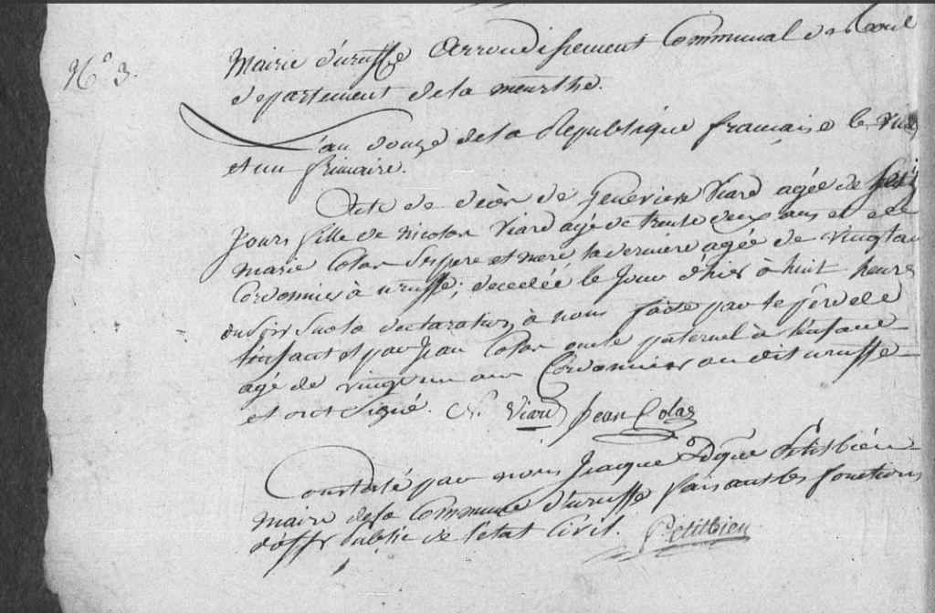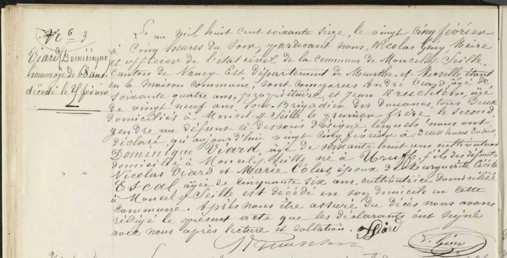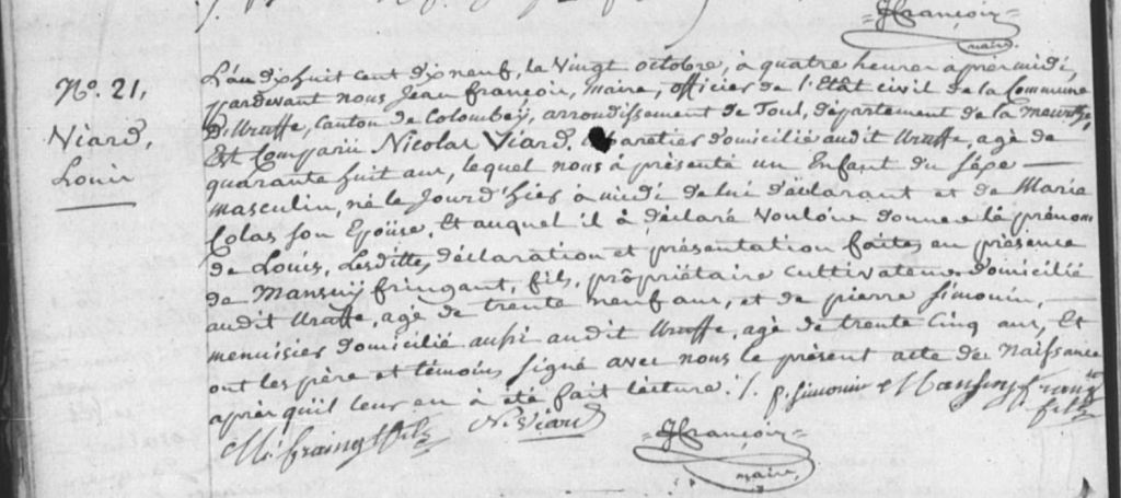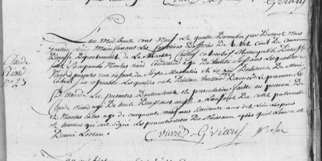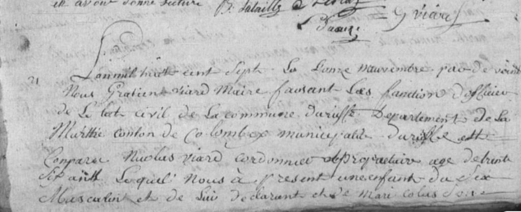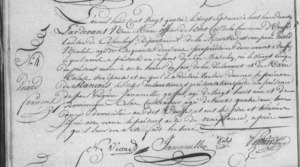 Gratien ayant été maire d’Uruffe entre 1805 et 1812 il a lui-même rédigé quasiment tous les actes concernant sa famille durant cette période. Plus tard deux Claude VIARD apparaissent, j’aimerais réussir à identifier qui ils sont car j’ai 4 Claude dans la famille. De même les FRINGANT, PETITBIEN, LAURENT et SIMONIN sont potentiellement liés à cette famille.