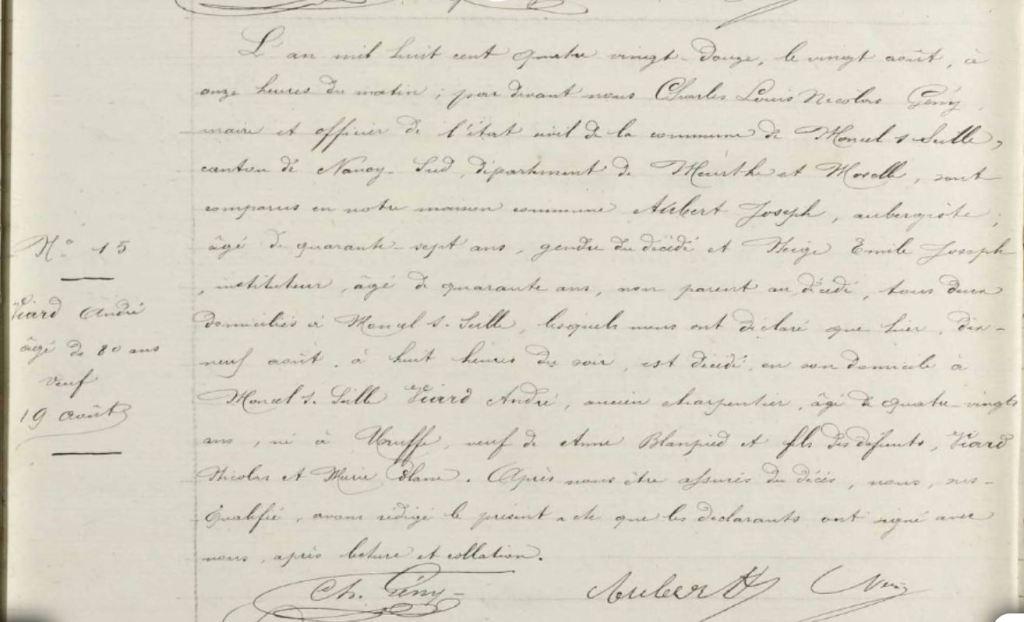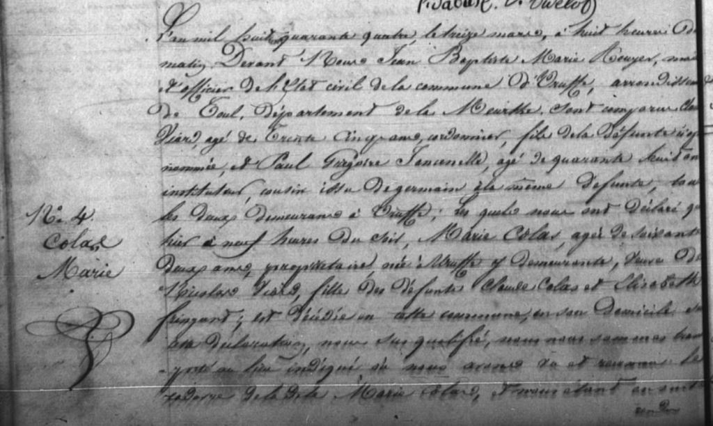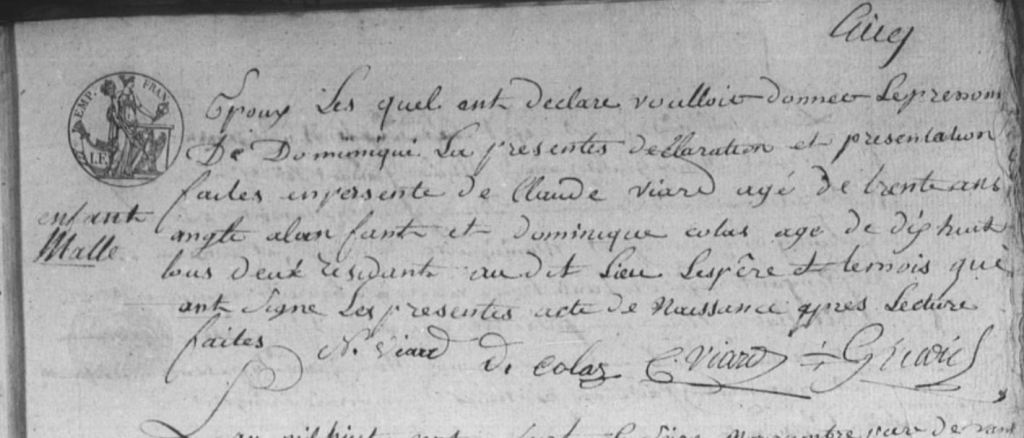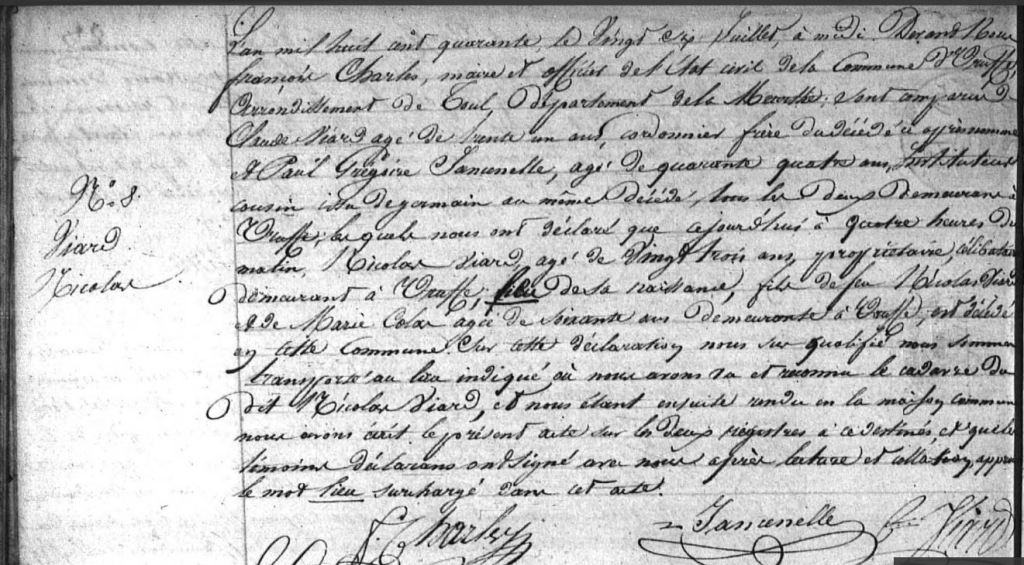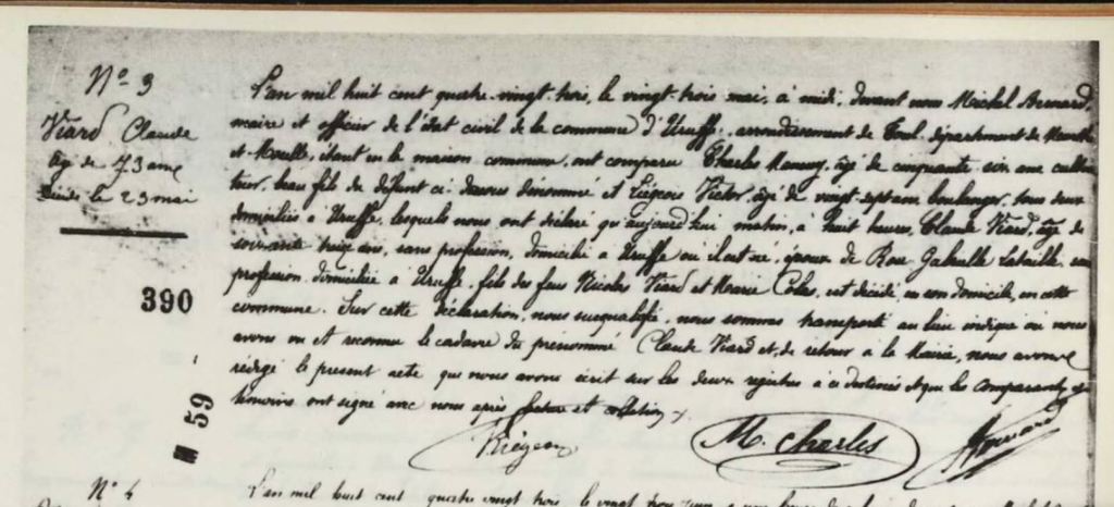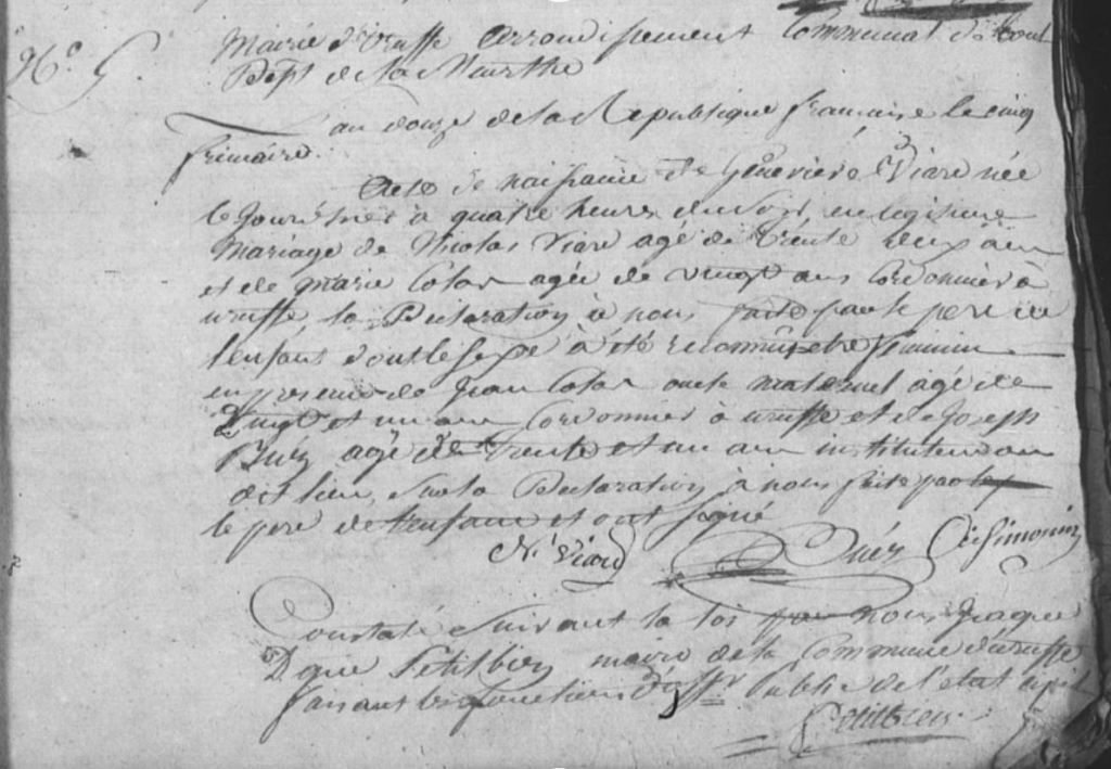 Gratien ayant été maire d’Uruffe entre 1805 et 1812 il a lui-même rédigé quasiment tous les actes concernant sa famille durant cette période. Plus tard deux Claude VIARD apparaissent, j’aimerais réussir à identifier qui ils sont car j’ai 4 Claude dans la famille. De même les FRINGANT, PETITBIEN, LAURENT et SIMONIN sont potentiellement liés à cette famille.