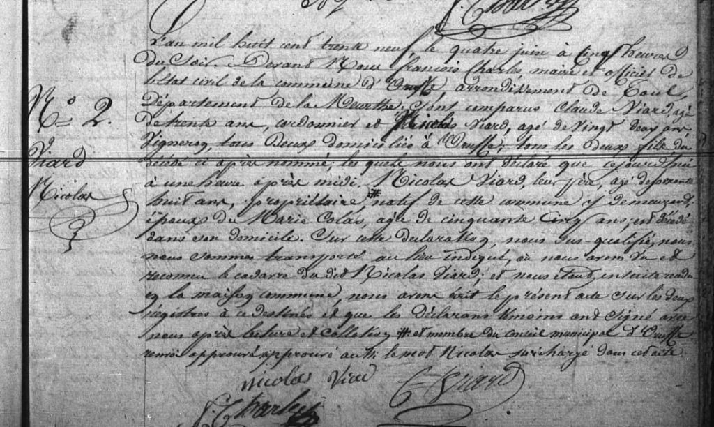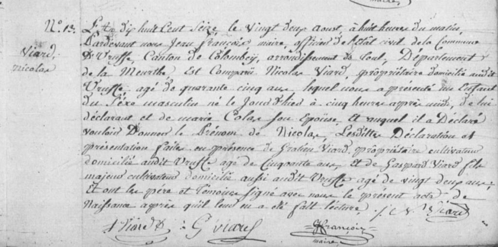Nicolas Viard est né le 20 juin 1771 à Uruffe en Meurthe-et-Moselle, il est mon sosa 106 c’est à dire mon aïeul à la 6è génération.