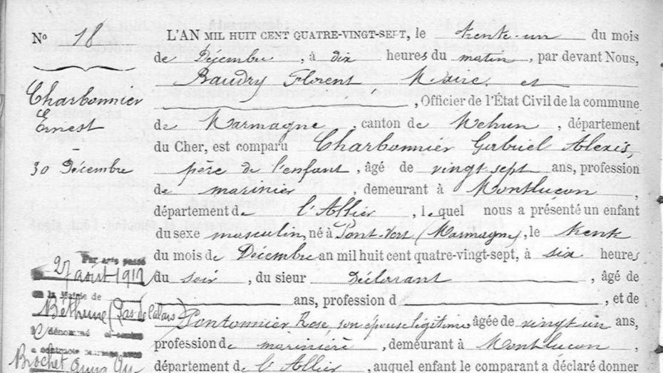 Le premier enfant Ernest est né à Marmagne (Cher) le 31 décembre 1887.
