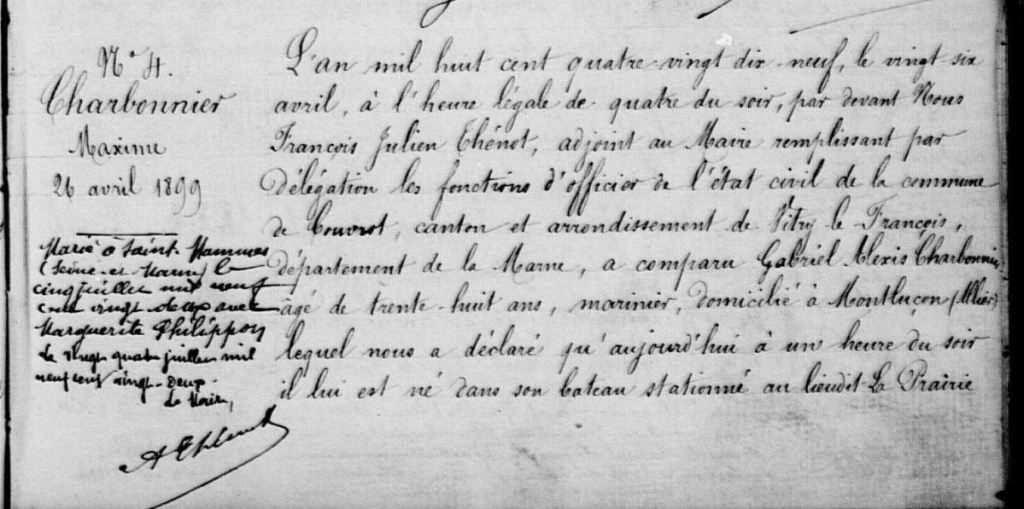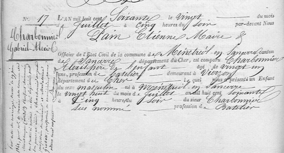 Lui est né le 28 juillet 1860 à Ménétréol-sous-Sancerre (Cher) d’Auguste CHARBONNIER et Madeleine GROSBOT un couple de mariniers. Petit détail étonnant sur l’acte de naissance Auguste (nommé Alexis sur cet acte) déclare que Madeleine est sa femme or ils ne se marient que deux ans plus tard.