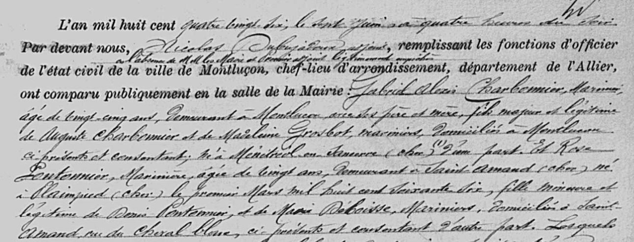Je vous présente le couple Gabriel Alexis CHARBONNIER et Rose PONTONNIER. Ils se marient le 7 juin 1886 à Montluçon (Allier).