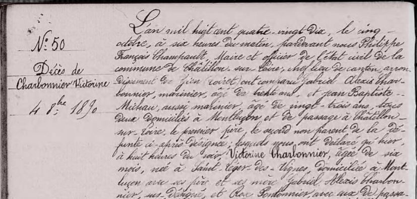 mais elle décède à seulement 6 mois le 5 octobre 1890 à Châtillon-sur-Loire (Loiret).