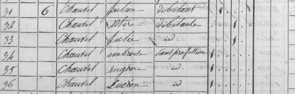 Julien Joseph CHAUVEL (sosa 66) est né le 1er octobre 1789 à Dinan de Joseph Marie et Pellagie ORIOU. Son père était débitant, il le deviendra également.