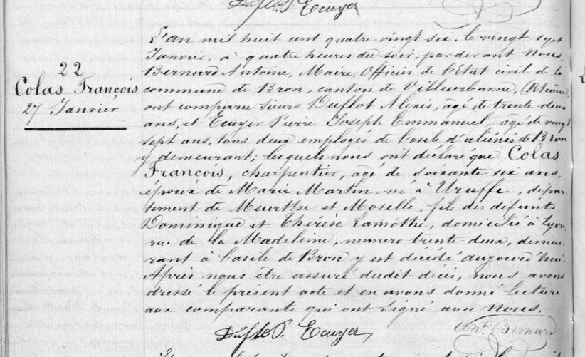 Nicolas Isidore est né en 1822. A-t-il changé d’identité ou est-ce une erreur de l’état-civil? C’est vraiment étrange que son décès soit fait au prénom et à la date de naissance de son ainé! Certes les déclarants travaillaient à l’asile d’aliéné de Lyon mais ils ne pouvaient pas connaitre ces informations!