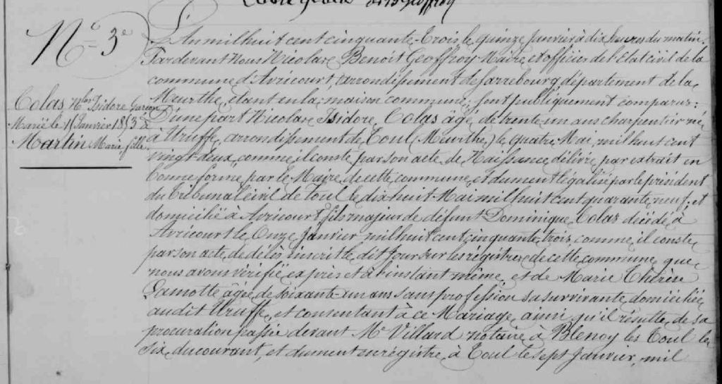 J’ai fini pas trouver le mariage de Nicolas Isidore COLAS,charpentier, fils de Dominique et Marie-Thérèse avec Marie MARTIN à Avricourt (Meuse) le 15 janvier 1853.