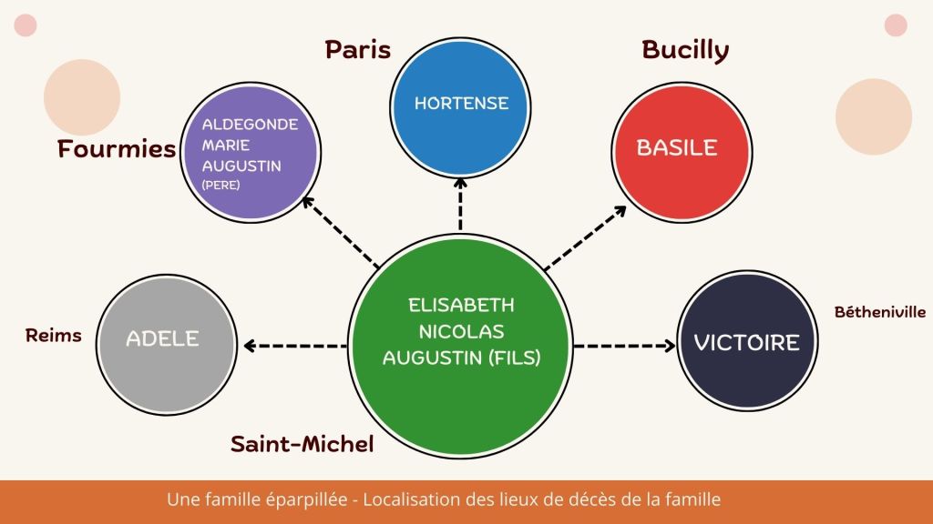 On se rend compte en faisant la généalogie des enfants d’Augustin que même si ils sont tous nés à Saint-Michel, tous ceux qui ont atteint l’âge adulte ont quitté ce village. Il en est de même pour Augustin. Ainsi ils sont tous décédés dans une autre commune que celle de leur naissance.