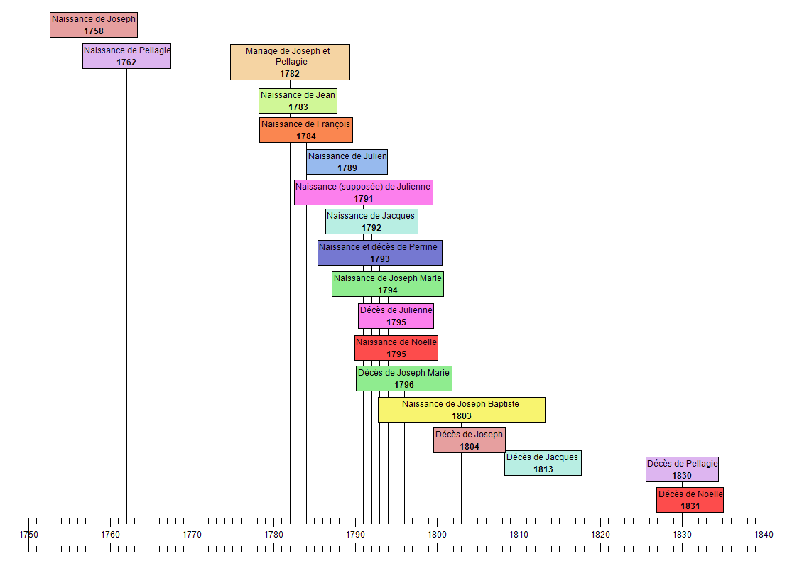 Joseph est décédé le le 5 juin 1804 à Dinan laissant Pellagie seule avec des enfants en bas âge. Celle-ci décède chez elle à Léhon le 6 octobre 1830 sans s’être remariée.