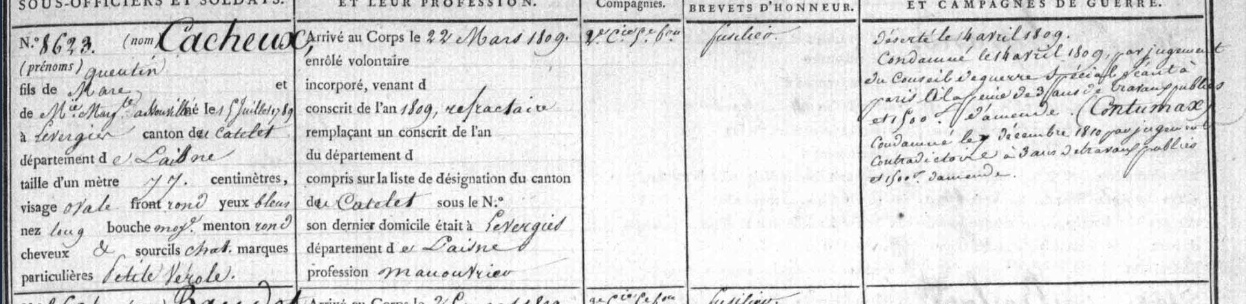 Elle épouse Quentin CACHEUX un mulquinier. Au moment du mariage Quentin a l’autorisation du 132 è régiment d’infanterie auquel il appartient après avoir été réfractaire en 1809. Quant à Marie Magdeleine, elle a déjà 2 enfants nés hors mariage avant.