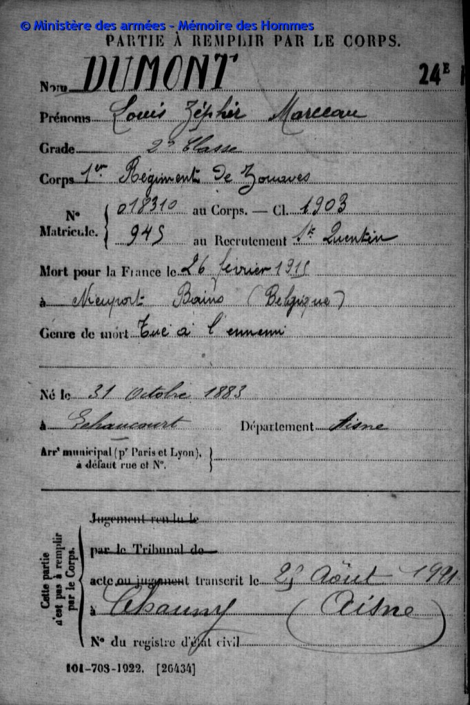 Louis Zéphir Marceau est né à Léhaucourt le 1er novembre 1883. A sa naissance il n’est reconnu que par sa mère Blanche CORBISET.