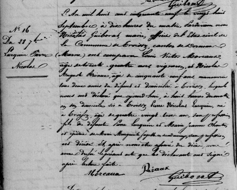 Pierre Nicolas est le second fils du couple Pierre LURQUIN et Marguerite CHEUTIN. Il est né le 21 mars 1776. Il devient vigneron comme son père.