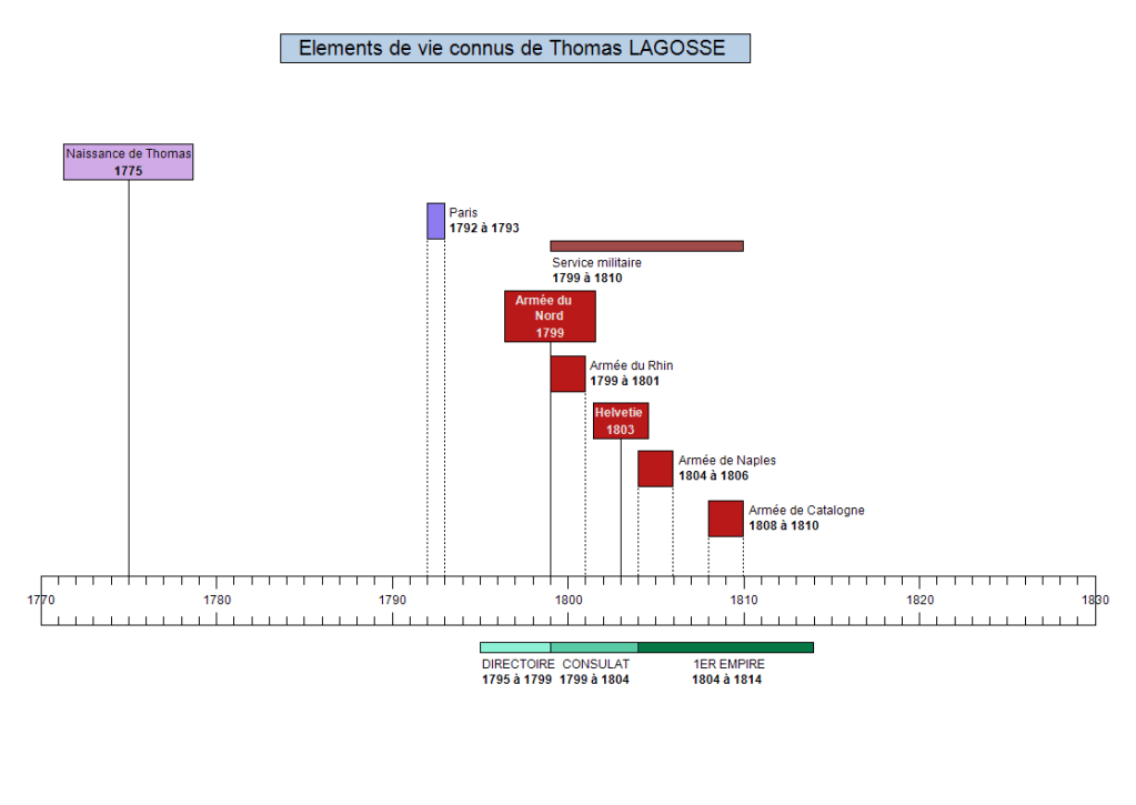 Ensuite il fait son service militaire jusqu’à ce qu’il soit réformé en 1810. Il est voltigeur au 42è régiment d’infanterie de ligne. Il a énormément voyagé en suivant les campagnes napoléoniennes. Tout d’abord dans l’armée du Nord, puis celle du Rhin, il passe ensuite en Helvétie (Suisse), puis dans l’armée de Naples pour terminer en Catalogne. Il était soldat de la France passant du statut de soldat de la république lorsqu’il arrivé au corps en 1799 à celui de soldat napoléonien les années suivantes.